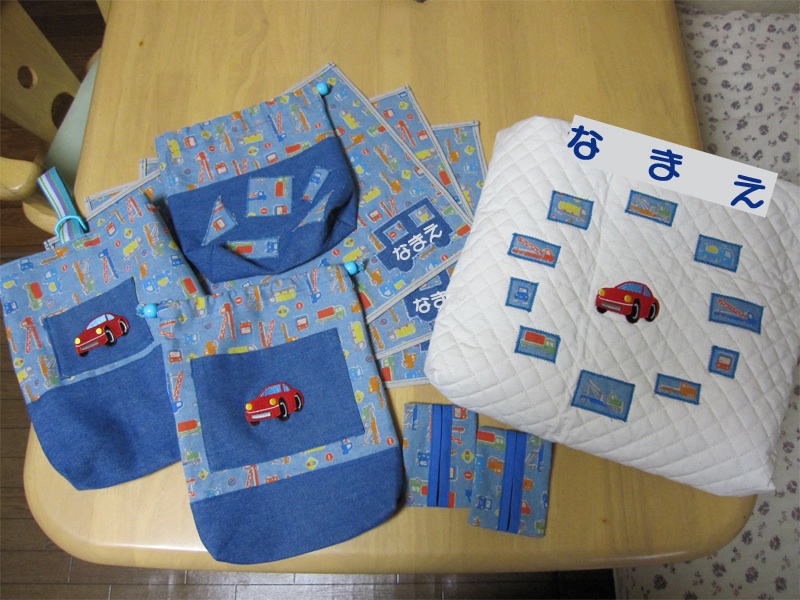 積み木入れ、給食セット入れ、ナプキン(サイズ指定のため、手作り必須)には車の形に切り取ったものをワッペンの如く縫い付けつつ名前書くスペースを確保。